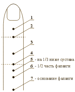 Лечение всего позвоночника можно проводить на верхней фаланге с тыльной стороны - минисистема соответствия. В миниатюре на указательном пальце и мизинце повторяет кисть, а, значит, весь организм; средний и безымянный палец (верхн. фаланги)- стопу.